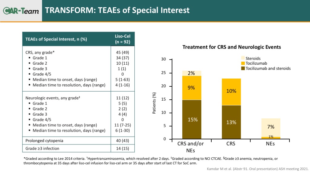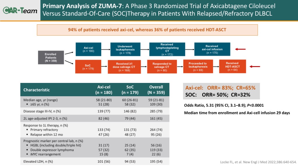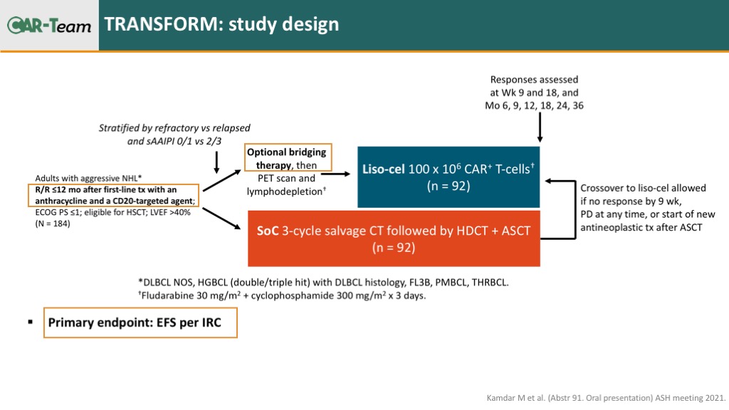 In questa presentazione vengono illustrati i risultati degli studi di fase III (ZUMA-7, BELINDA e TRANSFORM) sull'utilizzo precoce della terapia con CAR-T nei pazienti con linfoma a grandi cellule recidivati o chemio-refrattari.
